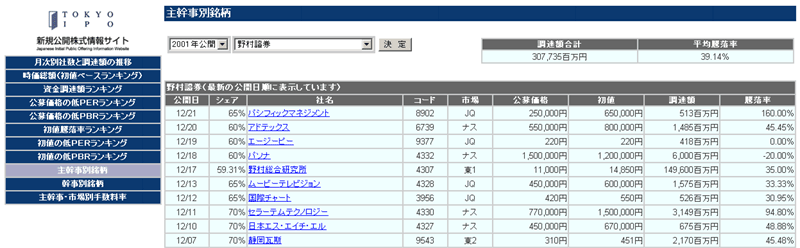 ◆企業情報では、仮条件、公募価格の提示とともに、PERとそのレンジ、PBRなどが表記されるほか、ランキングの項目では市場間や全市場でのPERランキングに照らした投資判断ができます。 IPOをした企業の各種ランキング 1.「資金調達額ランキング(全市場、市場別)」 2.「主幹事別銘柄」(初値騰落率のアベレージと資金調達額合計) 3.「幹事別銘柄」 4.「IPOの月別社数の推移(グラフ)(全市場、市場別)」 5.「時価総額ランキング(全市場、市場別)」 6.「低PERランキング(公募、初値)(全市場、市場別)」 7.「低PBRランキング(公募、初値)(全市場、市場別)」 8.「初値の騰落率ランキング(全市場、市場別)」 |